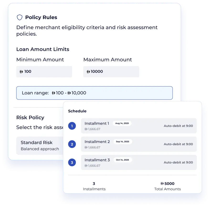 Control tenors, limits, grace periods, and merchant rules from a configurable dashboard.